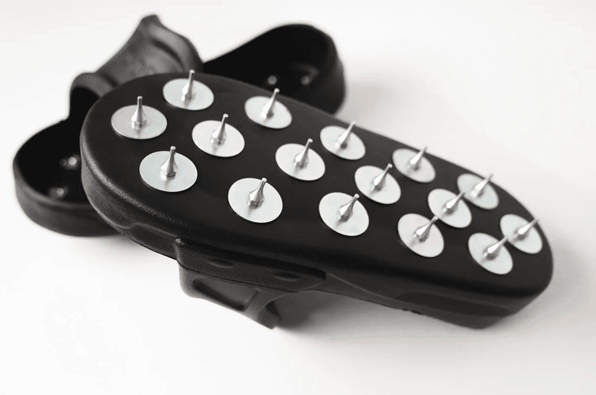 Fiecare pantof de aerare tip slip-on are 16 țepi cu vârfuri plate, neascuțite și măsoară 355 mm lungime și 175 mm lățime. Vă rugăm să rețineți că nu recomandăm utilizarea acestui produs pentru mersul pe microciment.